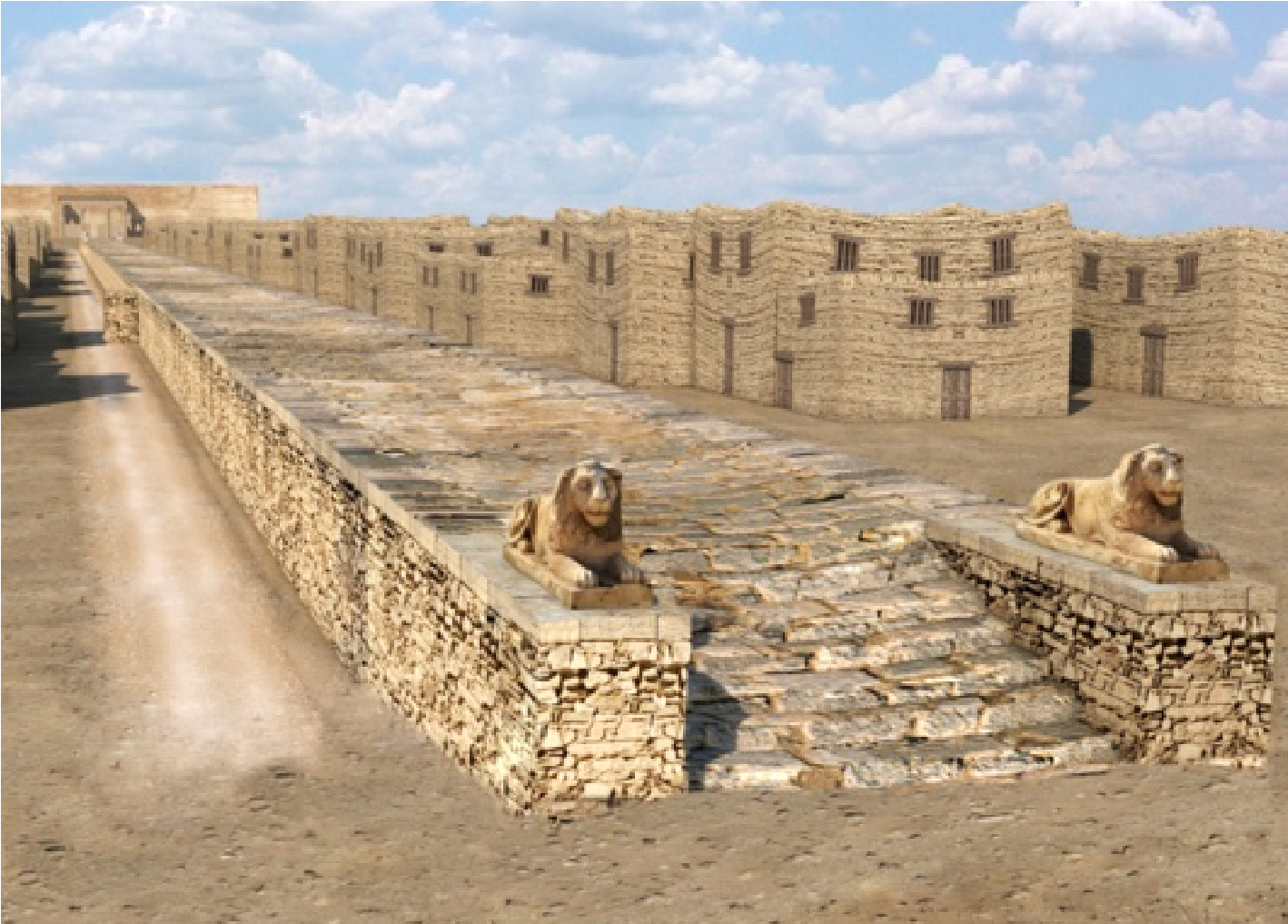 Dromos è un termine greco che designa la via processionale di un tempio. Si tratta di una struttura tipica dei templi egiziani, grazie alla quale essi in qualche modo si estendevano all’interno delle città. Su questa via monumentale si svolgevano le processioni durante le feste dedicate al dio, la cui statua (o una mummia, nel caso del coccodrillo sacro), veniva trasportata a spalla su una portantina dai sacerdoti. Durante queste feste la popolazione si accalcava ai bordi della strada e poteva “vedere” il dio. La via processionale era stata costruita in modo da essere sopraelevata di circa 3 m rispetto alle altre strade, in modo che le processioni fossero ben visibili anche a distanza. A Soknopaiou Nesos vi erano molte feste durante l’anno, le più importanti delle quali erano le celebrazioni del compleanno di Soknopaios e di Isis Nepherses, della durata di 19 giorni ciascuna, e la Festa delle Rose che durava 13 giorni. Ai lati del dromos erano spesso collocate sfingi o statue di leoni, guardiani per eccellenza, stele e statue private dedicate alla divinità e anche alberi.